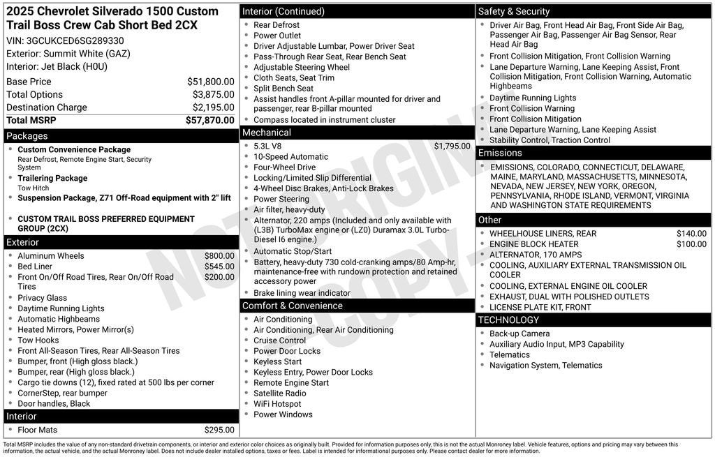 The Dealership That Puts You The Customer First!!! Custom Convenience Package (Electric Rear-Window Defogger, EZ Lift Power Lock & Release Tailgate, LED Cargo Area Lighting, Remote Vehicle Starter System, and Theft Deterrent System (Unauthorized Entry)), Preferred Equipment Group 2CX (10-Way Power Driver Seat w/Lumbar, 120-Volt Bed Mounted Power Outlet, 120-Volt Interior Power Outlet, 3.5 Monochromatic Display Driver Info Center, Auto-Locking Rear Differential, Bluetooth® For Phone, Color-Keyed Carpeting Floor Covering, Deep-Tinted Glass, Dual Rear USB Ports (Charge Only), Electronic Cruise Control, Front Rubberized Vinyl Floor Mats, HD Rear Vision Camera, Manual Tilt Wheel Steering Column, OnStar Services Capable, Performance Red Recovery Hooks, Power Front Windows w/Driver Express Up/Down, Power Front Windows w/Passenger Express Down, Power Rear Windows w/Express Down, Rear 60/40 Folding Bench Seat (Folds Up), Rear Rubberized-Vinyl Floor Mats, Remote Keyless Entry, SiriusXM Trial Subscription, Standard Tailgate, Teen Driver, Tire Pressure Monitoring System, and Wi-Fi Hot Spot Capable), Suspension Package (Heavy-Duty Air Filter and Hill Descent Control), Trailering Package (Hitch Guidance), 10-Speed Automatic, 4WD, Black Cloth, 170 Amp Alternator, 220 Amp Alternator, 4-Wheel Disc Brakes, 40/20/40 Front Split-Bench Seat, 6 Speakers, 6-Speaker Audio System, ABS brakes, Air Conditioning, All-Weather Floor Liner (LPO) (AAK), Alloy wheels, AM/FM radio: SiriusXM, Apple CarPlay/Android Auto, Auto High-beam Headlights, Automatic Emergency Braking, Auxiliary External Transmission Oil Cooler, Brake assist, Chevytec Spray-On Black Bedliner, Cloth Seat Trim, Compass, Delay-off headlights, Driver door bin, Driver vanity mirror, Dual Exhaust w/Polished Outlets, Dual front impact airbags, Dual front side impact airbags, Electronic Stability Control, Emergency communication system: OnStar, Engine Block Heater, External Engine Oil Cooler, Following Distance Indicator, Forward Collision Alert, Front anti-roll bar, Front Center Armrest w/Storage, Front License Plate Kit, Front Pedestrian Braking, Front reading lights, Front wheel independent suspension, Fully automatic headlights, Heated door mirrors, Illuminated entry, IntelliBeam Automatic High Beam On/Off, Lane Keep Assist w/Lane Departure Warning, Low tire pressure warning, Occupant sensing airbag, Outside temperature display, Overhead airbag, Overhead console, Panic alarm, Passenger door bin, Passenger vanity mirror, Power door mirrors, Power driver seat, Power steering, Power windows, Premium audio system: Chevrolet Infotainment 3, Radio data system, Radio: Chevrolet Infotainment 3 System, Rear reading lights, Rear step bumper, Rear Wheelhouse Liners, Rear window defroster, Remote keyless entry, Security system, Single Outlet Exhaust, Speed control, Speed-sensing steering, Split folding rear seat, Tachometer, Tilt steering wheel, Traction control, Trip computer, Variably intermittent wipers, Voltmeter, Wheels: 18 x 8.5 Black Painted Aluminum, and Wheels: 20 x 9 High Gloss Black Painted Alum. Price does not include taxes, tags and dealer fees. Price includes: $1500 - GM Bonus Cash. Exp. 02/02/2026 $3250 - Chevrolet Consumer Cash Program. Exp. 02/02/2026