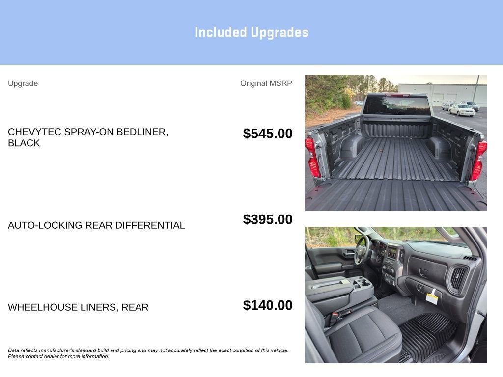 The Dealership That Puts You The Customer First!!! Custom Convenience Package (Electric Rear-Window Defogger, LED Cargo Area Lighting, and Remote Vehicle Starter System), Custom Value Package, High Capacity Suspension Package, Preferred Equipment Group 1CX (120-Volt Bed Mounted Power Outlet, 120-Volt Interior Power Outlet, 3.5 Monochromatic Display Driver Info Center, 40/20/40 Front Split-Bench Seat, Bluetooth® For Phone, Cloth Seat Trim, Color-Keyed Carpeting Floor Covering, Deep-Tinted Glass, Electronic Cruise Control, Front Frame-Mounted Black Recovery Hooks, Front Rubberized Vinyl Floor Mats, HD Rear Vision Camera, Manual Tilt Wheel Steering Column, OnStar Services Capable, Rear Rubberized-Vinyl Floor Mats, Remote Keyless Entry, SiriusXM Trial Subscription, Standard Tailgate, Teen Driver, Tire Pressure Monitoring System, and Wi-Fi Hot Spot Capable), Trailering Package (Hitch Guidance), 8-Speed Automatic, Black Cloth, 3.42 Rear Axle Ratio, 4-Wheel Disc Brakes, 6 Speakers, 6-Speaker Audio System, ABS brakes, Air Conditioning, Alloy wheels, AM/FM radio: SiriusXM, Apple CarPlay/Android Auto, Auto High-beam Headlights, Auto-Locking Rear Differential, Automatic Emergency Braking, Brake assist, Bumpers: body-color, Compass, Delay-off headlights, Driver door bin, Driver vanity mirror, Dual front impact airbags, Dual front side impact airbags, Electronic Stability Control, Emergency communication system: OnStar, Following Distance Indicator, Forward Collision Alert, Front anti-roll bar, Front Center Armrest w/Storage, Front Pedestrian Braking, Front reading lights, Front wheel independent suspension, Fully automatic headlights, Heated door mirrors, Illuminated entry, Low tire pressure warning, Occupant sensing airbag, Outside temperature display, Overhead airbag, Overhead console, Panic alarm, Passenger door bin, Passenger vanity mirror, Power door mirrors, Power driver seat, Power steering, Power windows, Premium audio system: Chevrolet Infotainment 3, Radio data system, Radio: Chevrolet Infotainment 3 System, Rear reading lights, Rear step bumper, Rear Wheelhouse Liners, Rear window defroster, Remote keyless entry, Security system, Speed control, Speed-sensing steering, Split folding rear seat, Tachometer, Tilt steering wheel, Traction control, Trip computer, Variably intermittent wipers, Voltmeter, and Wheels: 20 x 9 Bright Silver Painted Aluminum. Price does not include taxes, tags and dealer fees. Price includes: $1000 - GM Bonus Cash. Exp. 02/02/2026 $3000 - Chevrolet Consumer Cash Program. Exp. 02/02/2026