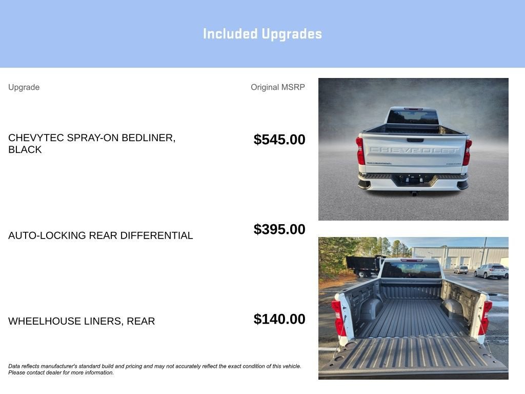 The Dealership That Puts You The Customer First!!! Custom Convenience Package (Electric Rear-Window Defogger, EZ Lift Power Lock & Release Tailgate, LED Cargo Area Lighting, Remote Vehicle Starter System, and Theft Deterrent System (Unauthorized Entry)), Custom Value Package, High Capacity Suspension Package, Preferred Equipment Group 1CX (10-Way Power Driver Seat w/Lumbar, 120-Volt Bed Mounted Power Outlet, 120-Volt Interior Power Outlet, 3.5 Monochromatic Display Driver Info Center, Bluetooth® For Phone, Color-Keyed Carpeting Floor Covering, Deep-Tinted Glass, Dual Rear USB Ports (Charge Only), Electronic Cruise Control, Front Frame-Mounted Black Recovery Hooks, Front Rubberized Vinyl Floor Mats, HD Rear Vision Camera, Manual Tilt Wheel Steering Column, OnStar Services Capable, Power Front Windows w/Driver Express Up/Down, Power Front Windows w/Passenger Express Down, Power Rear Windows w/Express Down, Rear 60/40 Folding Bench Seat (Folds Up), Rear Rubberized-Vinyl Floor Mats, Remote Keyless Entry, SiriusXM Trial Subscription, Standard Tailgate, Teen Driver, Tire Pressure Monitoring System, and Wi-Fi Hot Spot Capable), Trailering Package (Hitch Guidance), 8-Speed Automatic, 4WD, Black Cloth, 3.42 Rear Axle Ratio, 4-Wheel Disc Brakes, 40/20/40 Front Split-Bench Seat, 6 Speakers, 6-Speaker Audio System, ABS brakes, Air Conditioning, Alloy wheels, AM/FM radio: SiriusXM, Apple CarPlay/Android Auto, Auto High-beam Headlights, Auto-Locking Rear Differential, Automatic Emergency Braking, Brake assist, Bumpers: body-color, Chevytec Spray-On Black Bedliner, Cloth Seat Trim, Compass, Delay-off headlights, Driver door bin, Driver vanity mirror, Dual front impact airbags, Dual front side impact airbags, Electronic Stability Control, Emergency communication system: OnStar, Following Distance Indicator, Forward Collision Alert, Front anti-roll bar, Front Center Armrest w/Storage, Front License Plate Kit, Front Pedestrian Braking, Front reading lights, Front wheel independent suspension, Fully automatic headlights, Heated door mirrors, Illuminated entry, IntelliBeam Automatic High Beam On/Off, Lane Keep Assist w/Lane Departure Warning, Low tire pressure warning, Occupant sensing airbag, Outside temperature display, Overhead airbag, Overhead console, Panic alarm, Passenger door bin, Passenger vanity mirror, Power door mirrors, Power driver seat, Power steering, Power windows, Premium audio system: Chevrolet Infotainment 3, Radio data system, Radio: Chevrolet Infotainment 3 System, Rear reading lights, Rear step bumper, Rear Wheelhouse Liners, Rear window defroster, Remote keyless entry, Security system, Speed control, Speed-sensing steering, Split folding rear seat, Tachometer, Tilt steering wheel, Traction control, Trip computer, Variably intermittent wipers, Voltmeter, and Wheels: 20 x 9 Bright Silver Painted Aluminum. Price does not include taxes, tags and dealer fees. Price includes: $1000 - GM Bonus Cash. Exp. 02/02/2026 $3000 - Chevrolet Consumer Cash Program. Exp. 02/02/2026